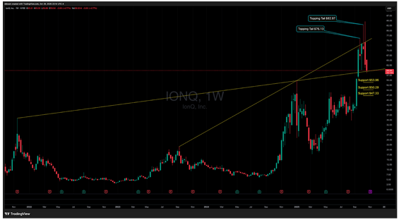 This sudden volatility wasn't entirely unexpected. Technical signals, specifically two distinct "topping tails" on the weekly chart, had foreshadowed this downside pressure as far back as September 22nd. With the stock now 30% off its recent highs, the immediate test is the validity of the inclining trendline, currently sitting at $59.36. Since IONQ is notoriously volatile, traders must be prepared for swift movements and potential level breakdowns.