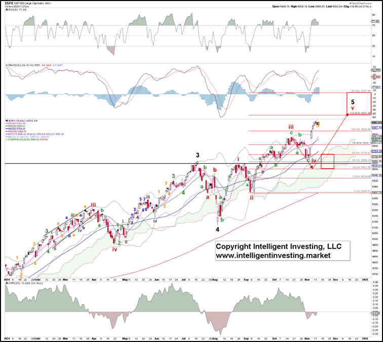 The index broke below the SPX5762 low three days after writing but held above the early October low as it bottomed out on November 4 at SPX5696. From there, it staged a strong rally, primarily after the US Presidential Election outcome. However, due to the drop into early November, the subdividing impulse we shared with you, i.e., “a more direct path to almost SPX6500,” has morphed (back) into the Ending Diagonal structure we have been tracking prior. See figure 1 below.