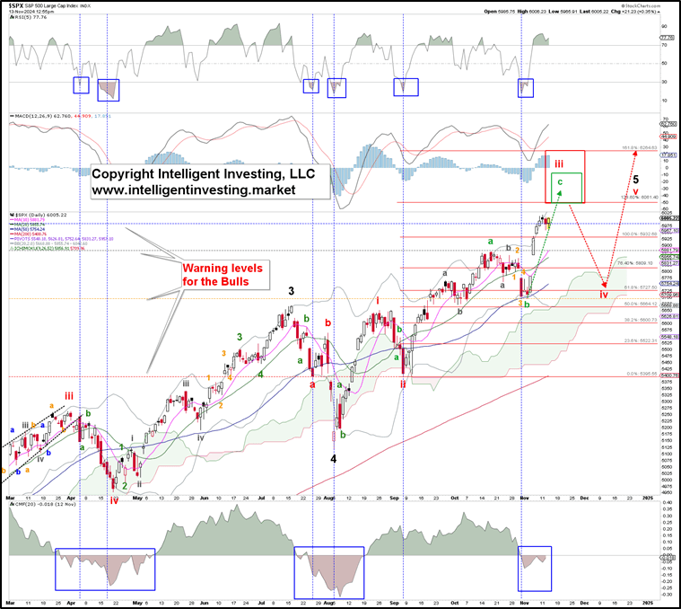 Ending Diagonals (EDs) are tricky because all their waves (i-ii-iii-iv-v) comprise three waves: 3-3-3-3-3 = abc-abc-abc-abc-abc. Besides, W-iii typically targets the 123.60% extension of W-i, measured from W-ii. The W-iv then tends to correct back to the 61.80% extension, after which the last W-v targets the 161.80% extension. In this case, we are looking at W-iii to reach at least SPX6060, W-iv should bottom around SPX5725, and W-v can reach at least SPX6260.