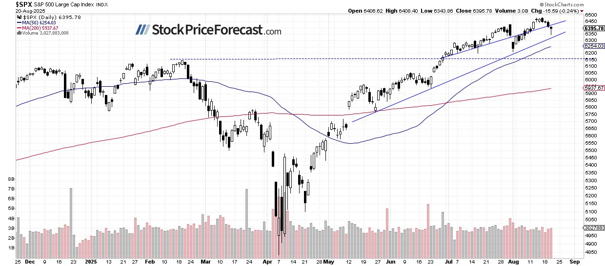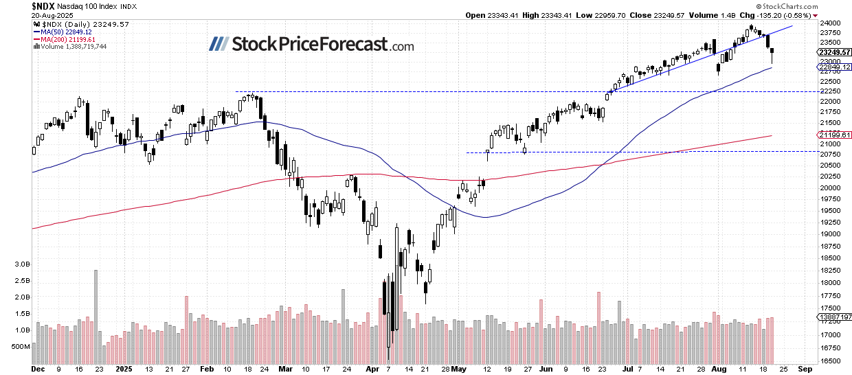 Stocks pulled back on Wednesday, but they rebounded from intraday lows, with the S&P 500 index closing just 0.24% below Tuesday’s close. Today, it is expected to open 0.4% lower, according to futures contracts, and may trade sideways following recent weakness. Markets are now waiting for the Jackson Hole symposium over the weekend, amid concerns about potentially hawkish comments from Fed Chair Powell.