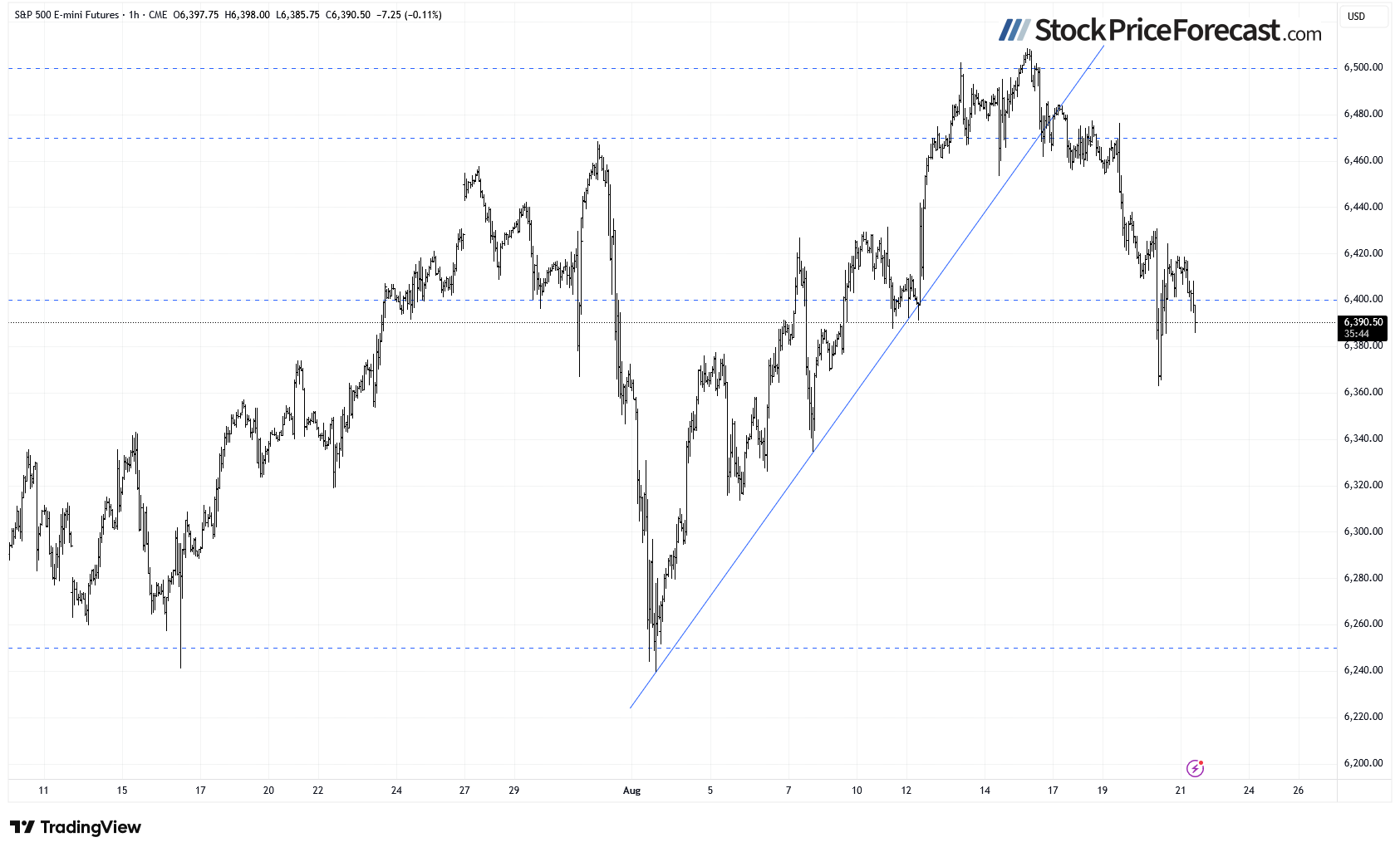 This morning, the S&P 500 futures contract is trading below the 6,400 level, retracing yesterday’s intraday rebound. Support is around 6,360, while resistance is at 6,420–6,430.