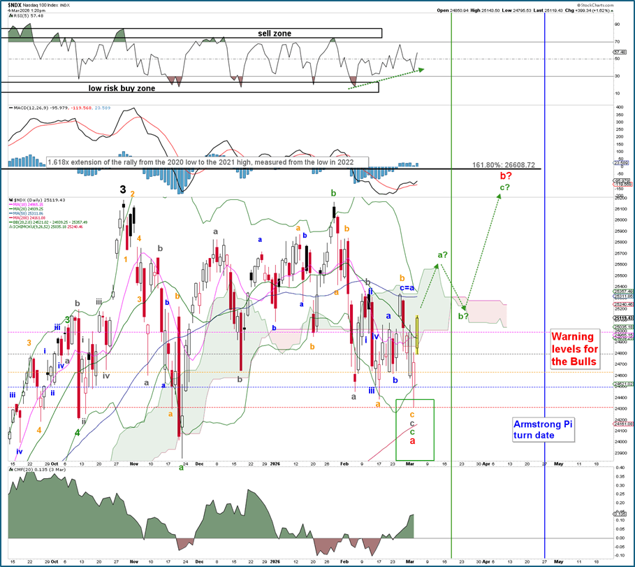 Fast forward: the index hit a low on February 5 (gray Wave-a), peaked on February 11 (gray W-b), and reached its bottom on February 17 (orange W-a). See Figure 1 below. So far, so good. However, it then made a secondary high on February 25 (orange W-b), and yesterday it dropped to its lowest level since the November 2025 low (red W-a) in response to the joint military operations in Iran. This detour was unexpected, but we simply can't predict every market move, especially during major geopolitical events, which often cause knee-jerk reactions. The index has now completely erased Monday’s losses.