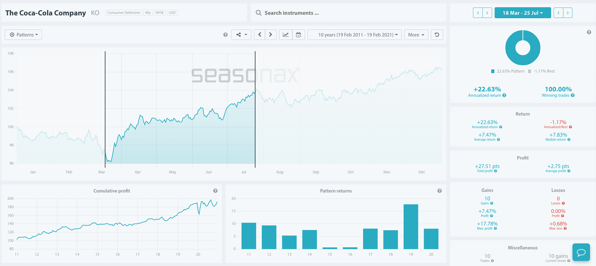 The Coca-Cola Company is entering into a strong time of year where it tends to see seasonal gains. Over the last 10 years, Coca-Cola has risen every single year between March 18 and July 25. The average return over the last 10 years has been +7.47%. The maximum profit was +17.78% in 2019. There have been no losses in the last 10 years.