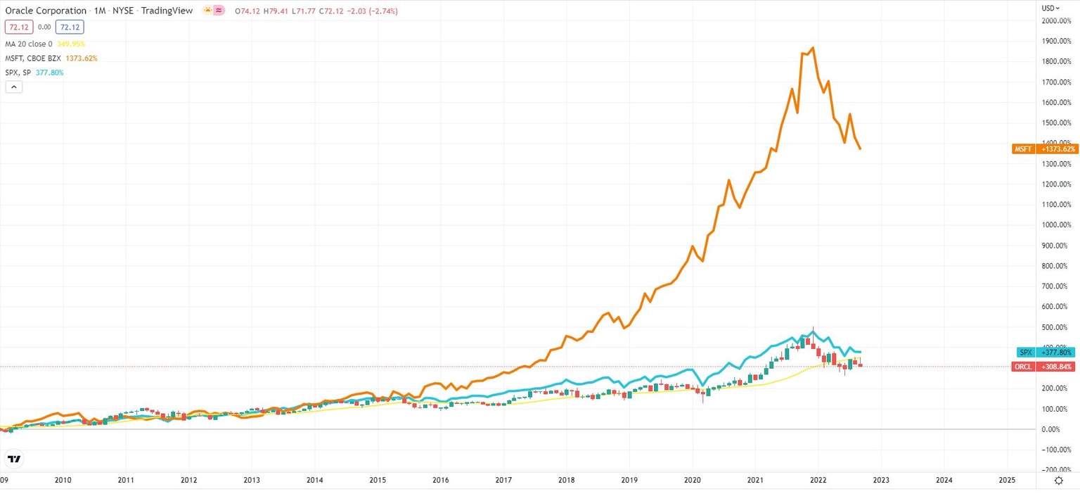 Oracle has still done quite well for itself though. While its share price underperforms the S&P 500 since 2009, the data is skewed since dividends go unnacounted for. When dividends are reinvested, Oracle returned 389% since 2009. This amounts to a not too shabby 12.28% annual return.