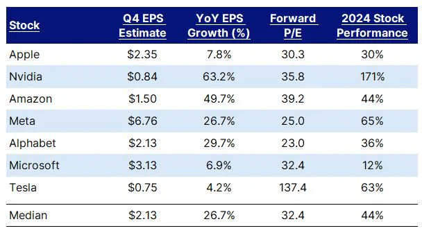 Apple’s Q4 2024 earnings, scheduled for January 30, could serve as a pivotal moment for the stock. Analysts expect weak results relative to the rest of the “Magnificent 7” tech giants, a trend that could extend into the March quarter of 2025. For Q4, Apple’s expected earnings growth at 7.8% trails the group, with its revenue hurt by soft iPhone demand and slower global growth.