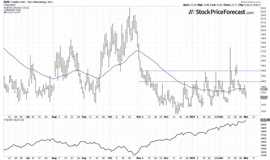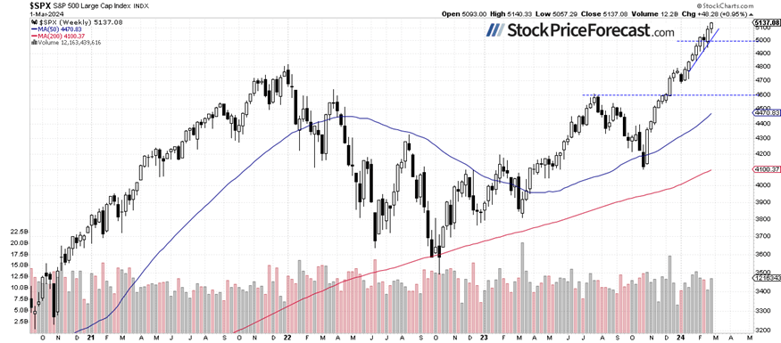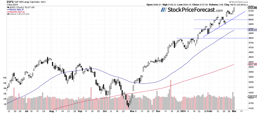 The Friday session started with a slight advance, but stock prices steadily climbed, closing 0.8% higher. The S&P 500 index broke the previous Friday's record, reaching a level of 5,140.33. On Friday, I wrote about February, “Despite concerns about stock valuations, the market rallied to new record highs, fueled by hopes of the Fed's monetary policy pivot and the AI revolution.”. And yet, it was the same story again on the first trading day of March.