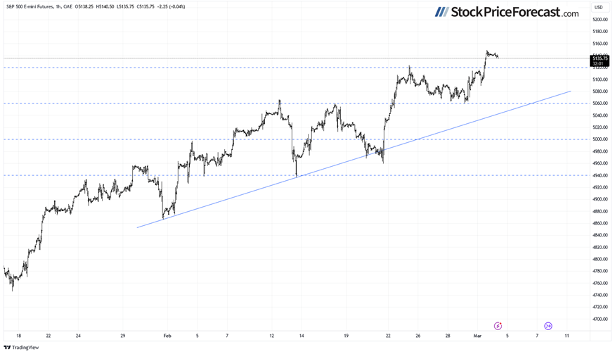 Let’s take a look at the hourly chart of the S&P 500 futures contract. On Friday, it reached a new record high of around 5,149, and this morning, it’s trading around 5,140. The support level is now at 5,100-5,120.