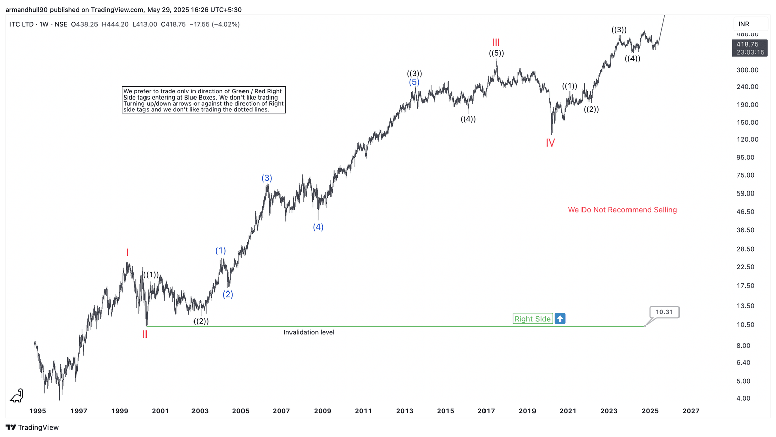 ITC Ltd (NSE: ITC) shows a powerful long-term bullish trend based on Elliott Wave analysis. The stock has followed a textbook impulse sequence since the 1990s. The wave count reveals a clear five-wave structure, suggesting more upside remains in the current cycle.