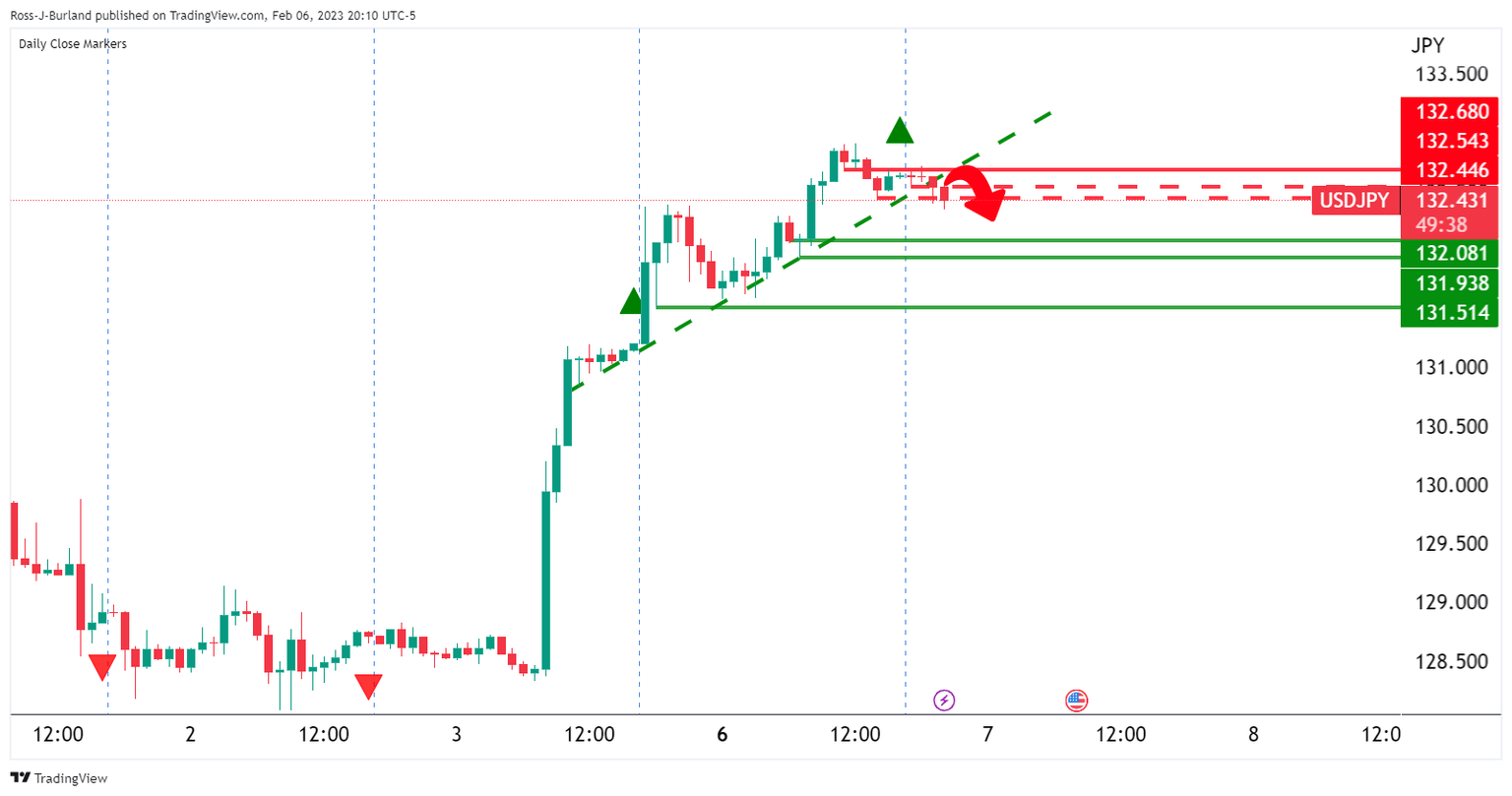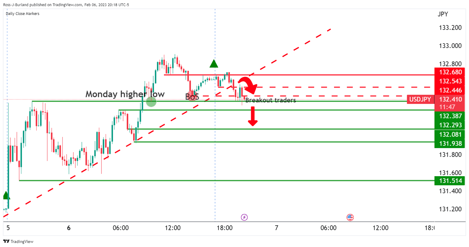 On the 15-min chart, the bears are potentially locking in a high for the day but are yet to crack below Monday's higher low of the day around 132.39: