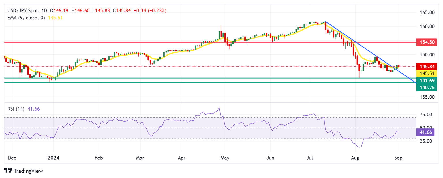 USD/JPY trades around 146.00 on Monday. Daily chart analysis shows the pair is situated above the downtrend line, suggesting a diminishing bearish bias. However, the 14-day Relative Strength Index (RSI) remains below 50, indicating that the bearish trend is still in effect.