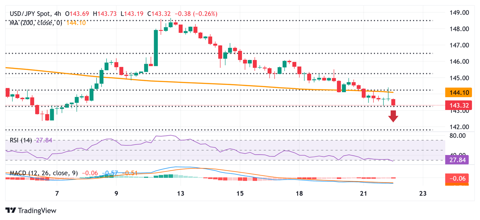 Meanwhile, oscillators on the daily chart have just started gaining negative traction and suggest that the path of least resistance for the USD/JPY pair remains to the downside. However, the Relative Strength Index (RSI) on the 4-hour chart has moved on the verge of breaking into oversold territory, making it prudent to wait for some near-term consolidation before positioning for the next leg of a downfall. That said, acceptance below the 143.20 area, or the 61.8% Fibo. retracement level, might prompt some technical selling and drag spot prices below the 143.00 round figure, to the next relevant support near the 142.40-142.35 area en route to the 142.00 mark.