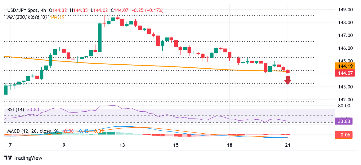 USD/JPY bears have the upper hand while below the 144.30-144.20 confluence breakpoint