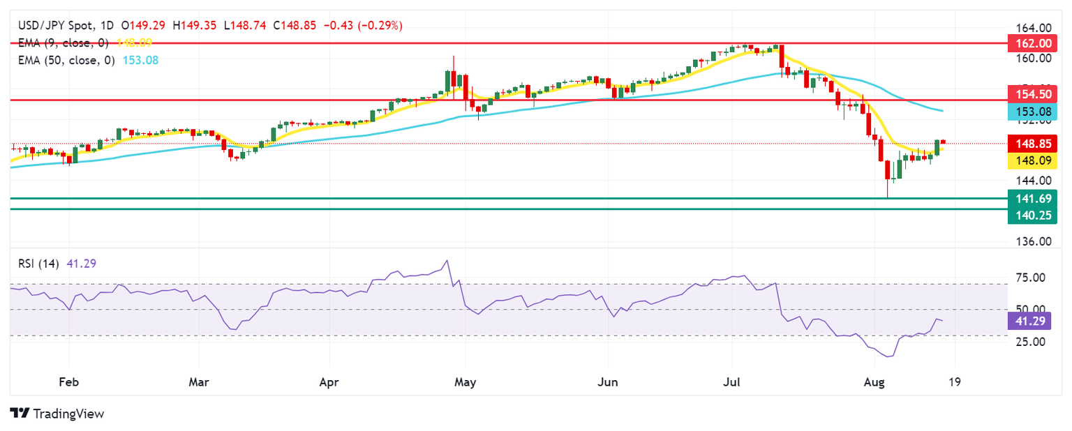 USD/JPY trades around 148.80 on Friday. According to the daily chart analysis, the pair is above the nine-day Exponential Moving Average (EMA), signaling a short-term bullish trend. Still, the 14-day Relative Strength Index (RSI) remains below 50, and an additional rise would confirm the bullish momentum.