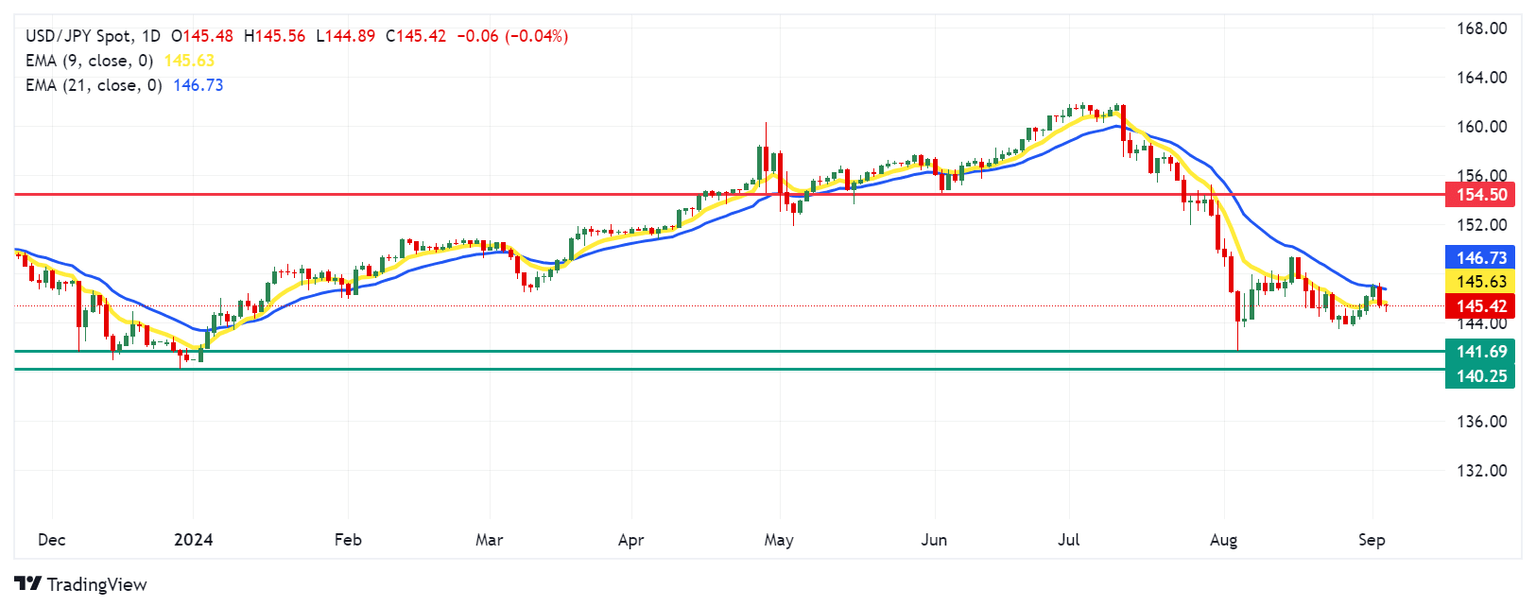 USD/JPY trades around 145.40 on Wednesday. An analysis of the daily chart shows that the nine-day Exponential Moving Average (EMA) is below the 21-day EMA, signaling a bearish trend in the market. Additionally, the 14-day Relative Strength Index (RSI) remains below 50, further confirming that the bearish trend is still in place.