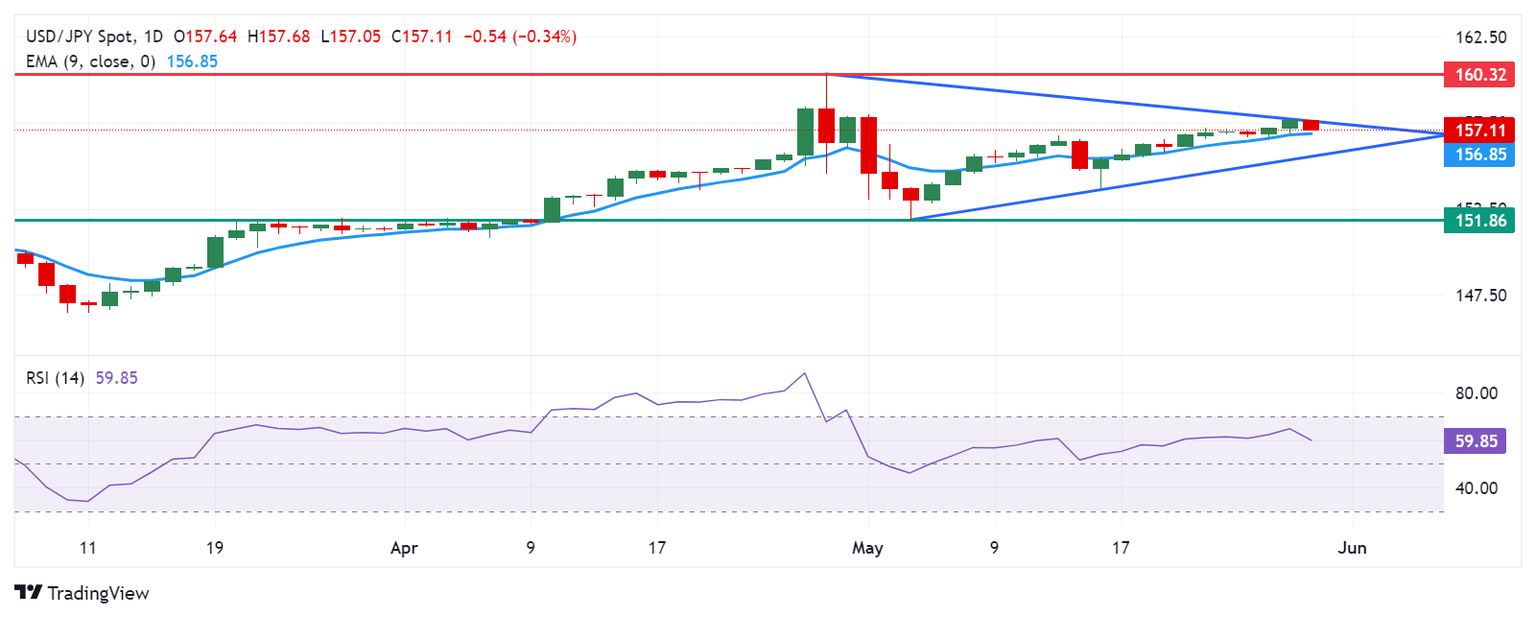 On the downside, the immediate support appears at the psychological level of 157.00, followed by the nine-day Exponential Moving Average (EMA) at 156.86. Further decline in the USD/JPY pair could apply downward pressure, potentially testing the lower boundary of the symmetrical triangle.