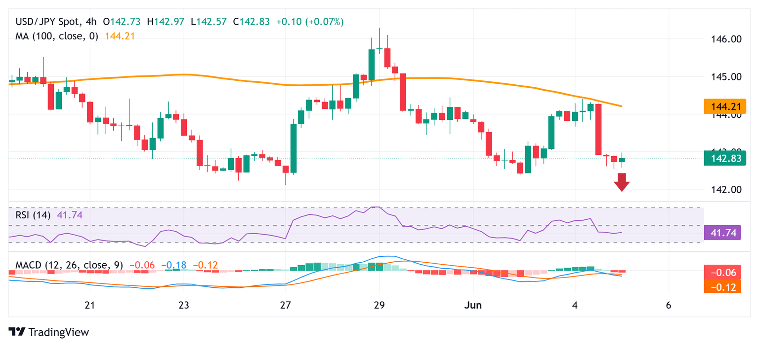 From a technical perspective, the overnight failure near the 100-period Simple Moving Average (SMA) on the 4-hour chart and the subsequent fall favors the USD/JPY bears. Moreover, technical indicators on hourly/daily charts are holding in negative territory, suggesting that the path of least resistance for spot prices is to the downside. Hence, any further move up could be seen as a selling opportunity near the 143.70 region and is likely to remain capped near the 144.00 mark. This is followed by the 144.25-144.30 region (100-period SMA on H4). Some follow-through buying beyond the overnight swing high could trigger an intraday short-covering move and allow bulls to reclaim the 145.00 psychological mark.