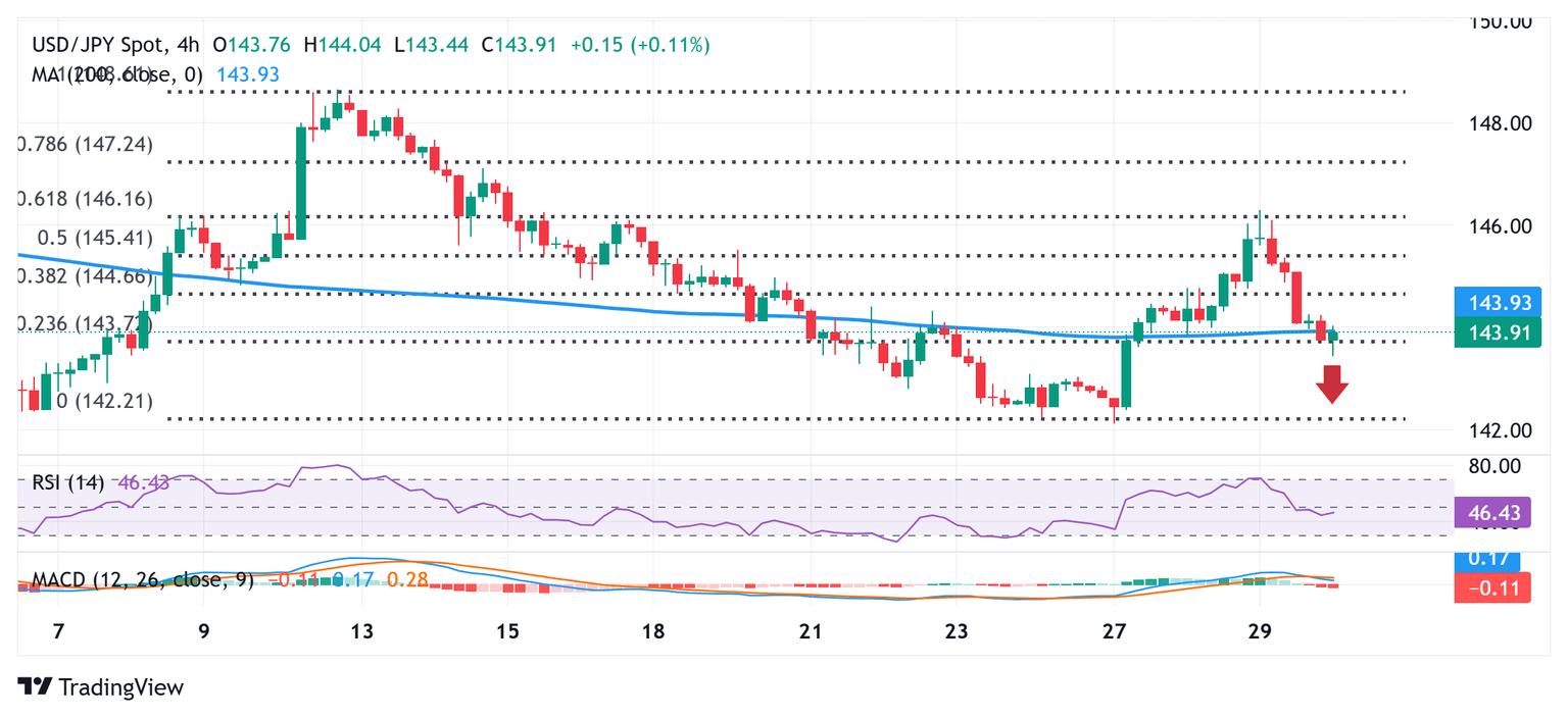 From a technical perspective, the overnight failure near the 61.8% Fibonacci retracement level of the recent downfall from the monthly peak and the subsequent fall favors the USD/JPY bears. Moreover, negative oscillators on daily/hourly charts suggest that the path of least resistance for spot prices is to the downside. Some follow-through selling below the 143.45 region will reaffirm the bearish outlook and drag the pair to the 143.00 mark. The downward trajectory could extend further towards the 142.40 intermediate support en route to the 142.10 area, or the monthly low touched on Tuesday.