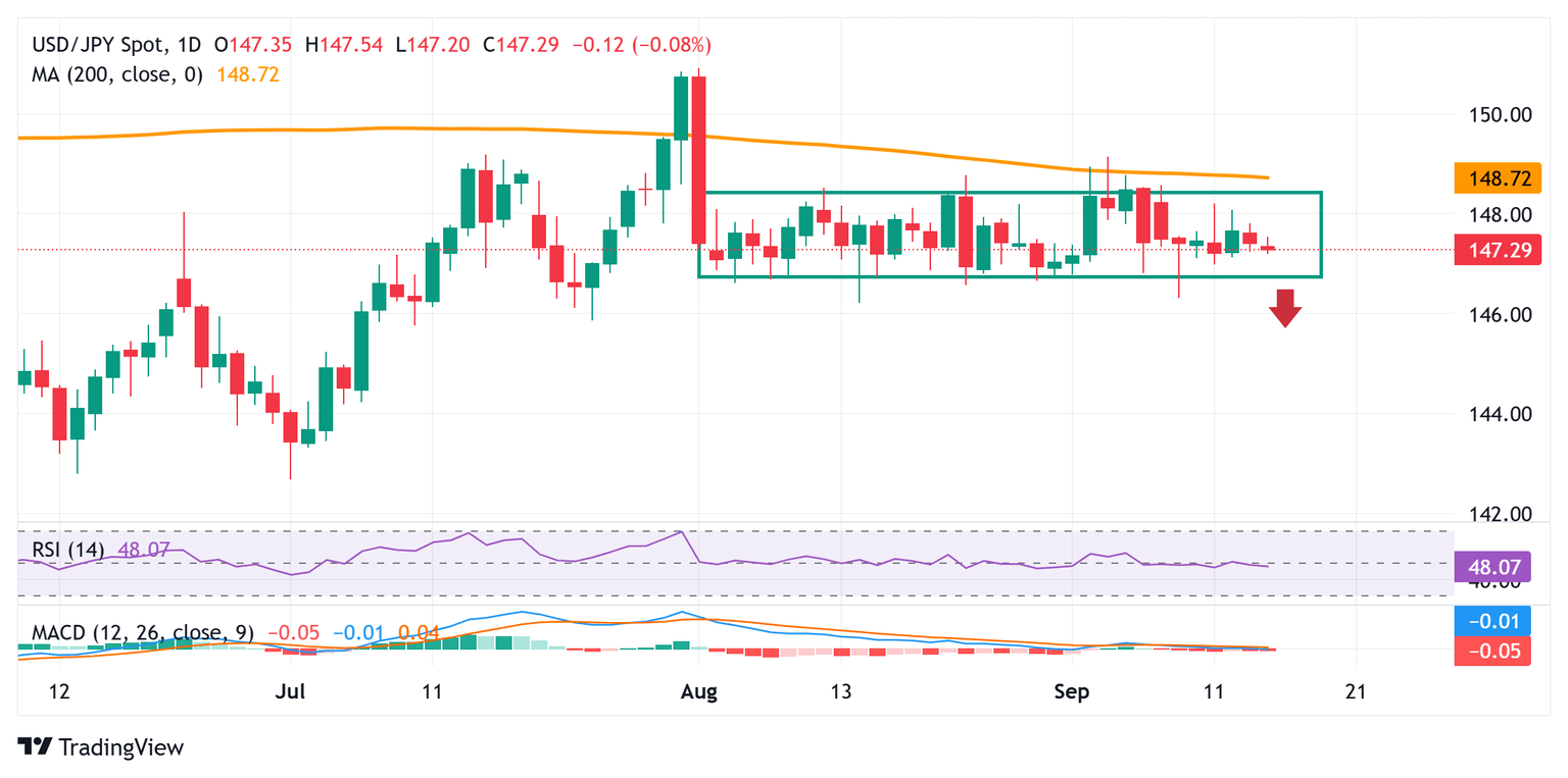 The range-bound price action might be seen as a consolidation phase before the next leg of a directional move. Meanwhile, the recent repeated failures near a technically significant 200-day Simple Moving Average (SMA) suggest that the path of least resistance for the USD/JPY pair is to the downside. That said, it will still be prudent to wait for some follow-through selling and acceptance below the 147.00 mark before positioning for further losses amid neutral oscillators on the daily chart. Spot prices might then accelerate the fall towards the 146.30-146.20 horizontal support. This is closely followed by the 146.00 round figure, below which the downward trajectory could extend further towards the 145.35 intermediate support en route to the 145.00 psychological mark.