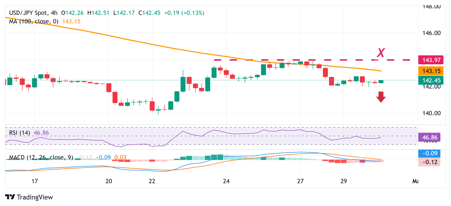 From a technical perspective, the USD/JPY pair earlier this week struggled to find acceptance above the 100-period Simple Moving Average (SMA) on the 4-hour chart and faced rejection near the 144.00 mark. The subsequent downfall and negative oscillators on hourly/daily charts validate the near-term negative outlook. That said, it will still be prudent to wait for some follow-through selling below the 142.00 mark before positioning for deeper losses. Spot prices might then accelerate the fall towards the mid-141.00s en route to the 141.10-141.00 region. The downward trajectory could extend further towards the 140.50 intermediate support before the pair eventually drops to the multi-month low – levels below the 140.00 psychological mark touched last week.