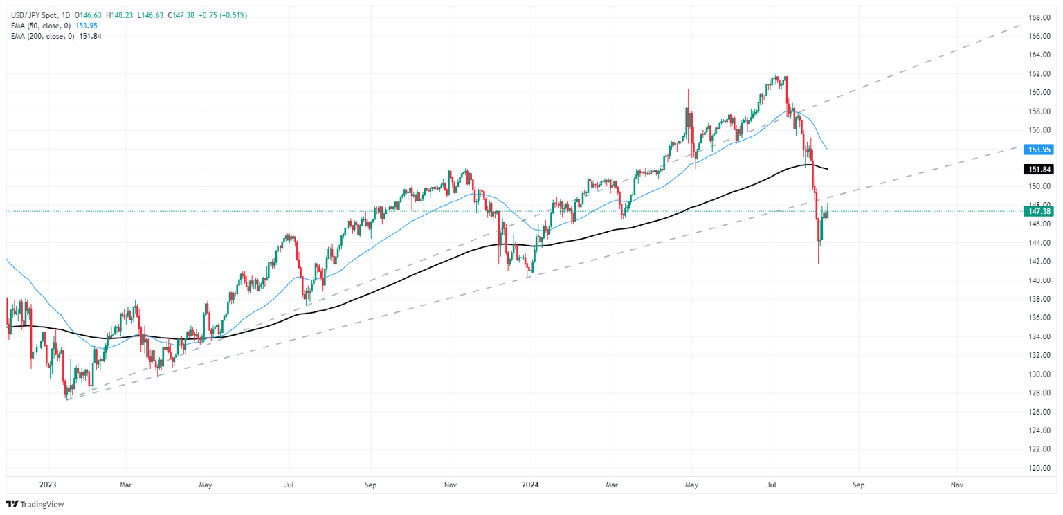 A broad-base recovery in the Yen helped to drag USD/JPY down from multi-decade highs, sending the pair plunging below the 200-day Exponential Moving Average (EMA) at 151.84. The pair reached a floor near 142.00 before buoying back to test the 148.00 region.