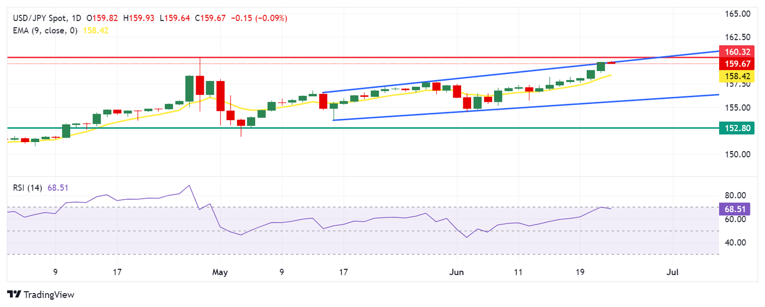 USD/JPY trades around 159.70 on Monday. Analyzing the daily chart shows a bullish bias, with the pair testing the upper boundary of an ascending channel pattern. Moreover, the 14-day Relative Strength Index (RSI) is above the 50 level, suggesting a tendency for upward momentum.