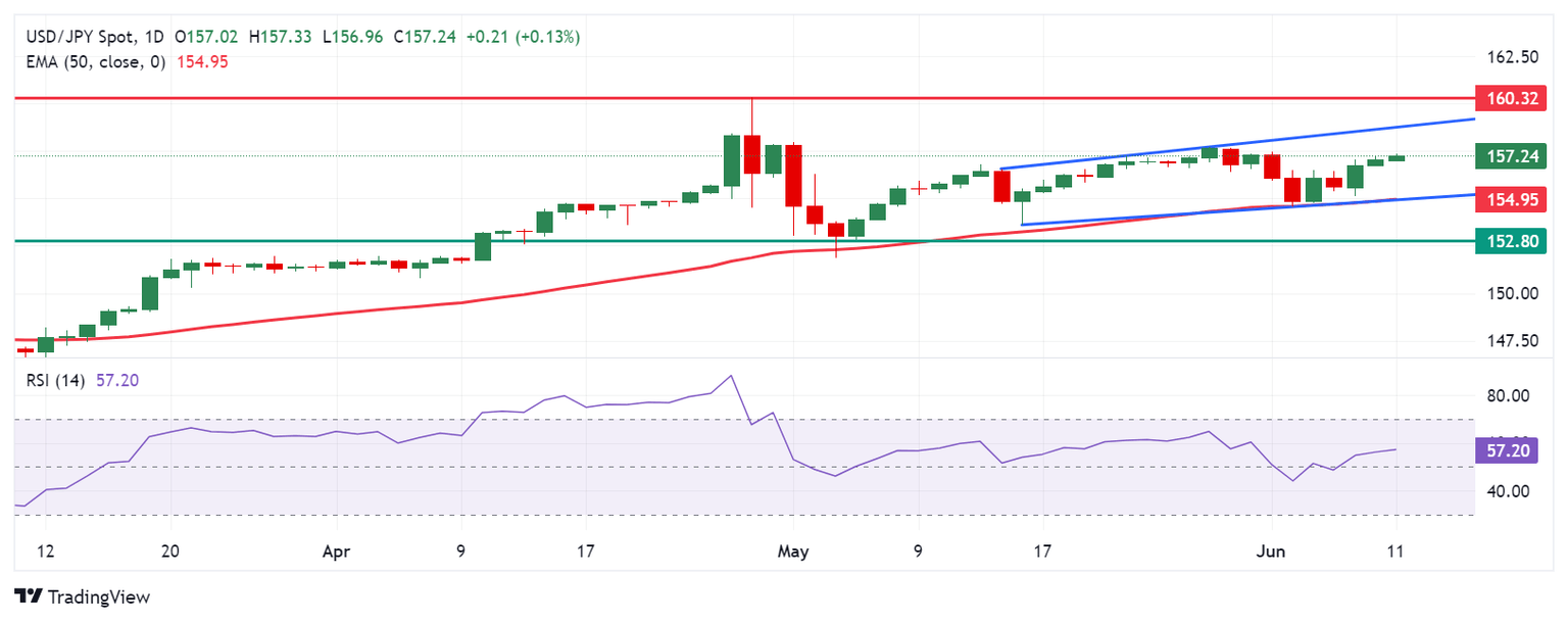 USD/JPY trades around 157.20 on Tuesday. Analysis of the daily chart reveals a bullish inclination as the pair consolidates within an ascending channel pattern. Additionally, the 14-day Relative Strength Index (RSI) sits above the 50 level, indicating a propensity for upward momentum.