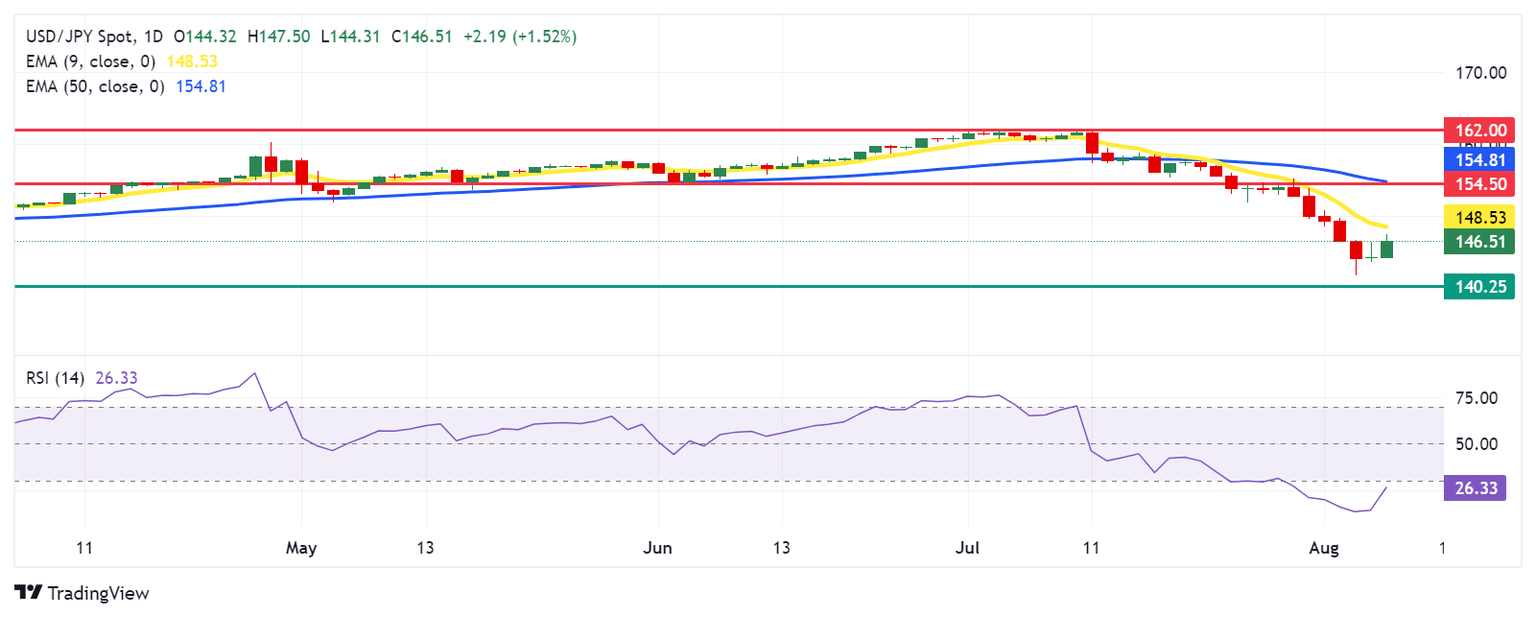 USD/JPY trades around 146.70 on Wednesday. The daily chart analysis shows that the pair continues to rise toward the nine-day Exponential Moving Average (EMA) at 148.57 level, suggesting a weakening of the bearish momentum. Additionally, the 14-day Relative Strength Index (RSI) is below 30, signaling that the currency pair is oversold and could see a short-term rebound.