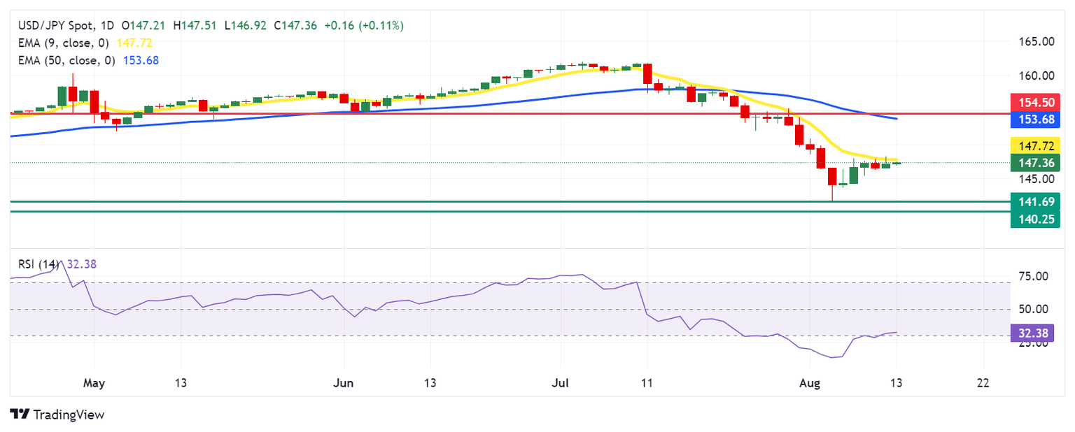 USD/JPY trades around 147.40 on Tuesday. The daily chart analysis shows that the pair remains below the nine-day Exponential Moving Average (EMA), suggesting a bearish trend in the short term. Moreover, the 14-day Relative Strength Index (RSI) has breached above the 30 level, suggesting a potential for a correction. If the RSI moves toward the 50 level, it could signal a potential improvement in the pair's momentum.