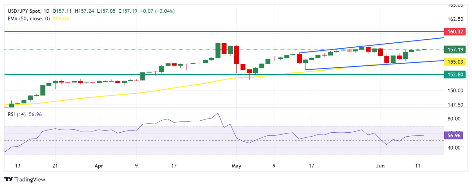 USD/JPY trades around 157.20 on Wednesday. Analysis of the daily chart suggests a bullish inclination as the pair consolidates within an ascending channel pattern. Additionally, the 14-day Relative Strength Index (RSI) is above the 50 level, indicating a tendency for upward momentum.