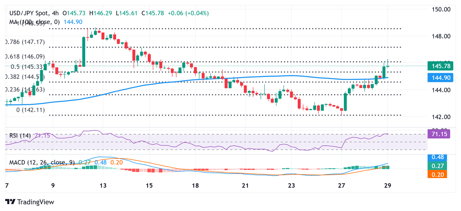From a technical perspective, the USD/JPY pair stalls its strong intraday move up near the 50% retracement level of the recent downfall from the monthly peak amid a slightly overbought Relative Strength Index (RSI) on hourly charts. That said, oscillators on the daily chart have just started gaining positive traction and support prospects for an extension of the weekly uptrend. Hence, any corrective pullback below the 145.35 region, or the 38.2% Fibonacci retracement level could be seen as a buying opportunity and remain limited near the 145.00 psychological mark. The latter is near the 200-period Simple Moving Average (SMA) on the 4-hour chart, which if broken will negate the near-term positive outlook.