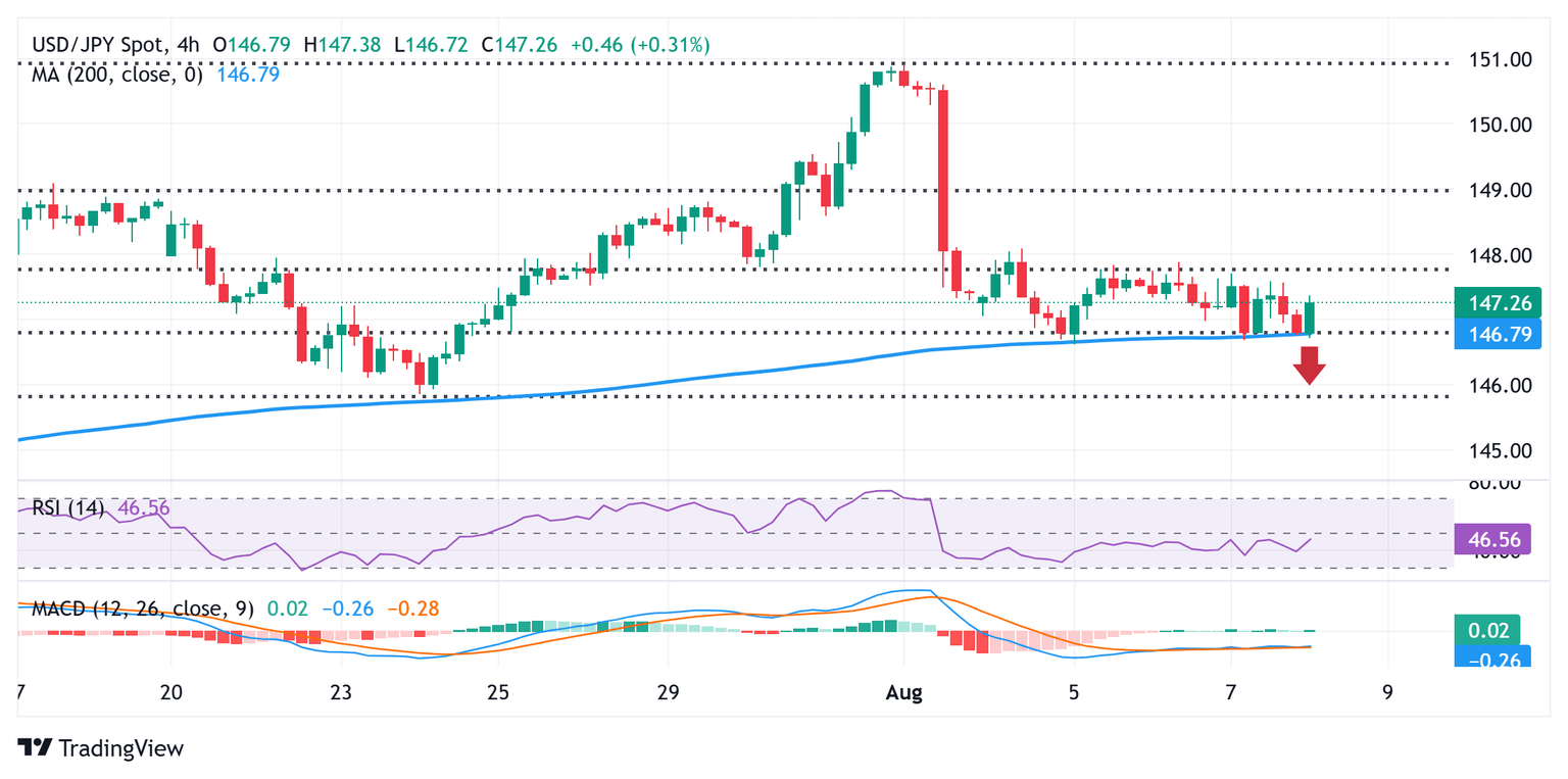 On the flip side, the 146.75-146.70 confluence – comprising the 200-period Simple Moving Average (SMA) on the 4-hour and the 50% Fibo. retracement level – might continue to protect the immediate downside. A convincing break below should pave the way for deeper losses and drag the USD/JPY pair to sub-146.00 levels, or the 61.8% Fibo. retracement level. Some follow-through selling below the latter could expose the 145.00 psychological mark.
