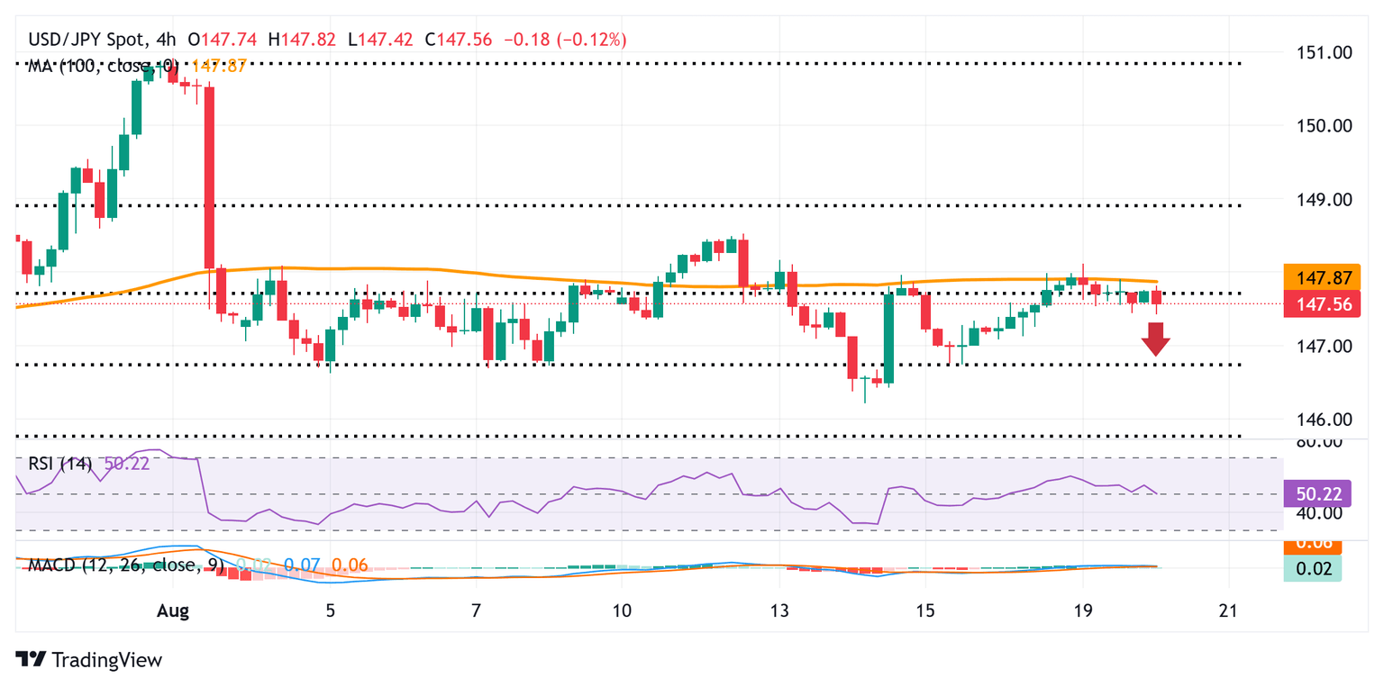 USD/JPY approaches 147.10-147.00 support zone; remains confined in a three-week-old range