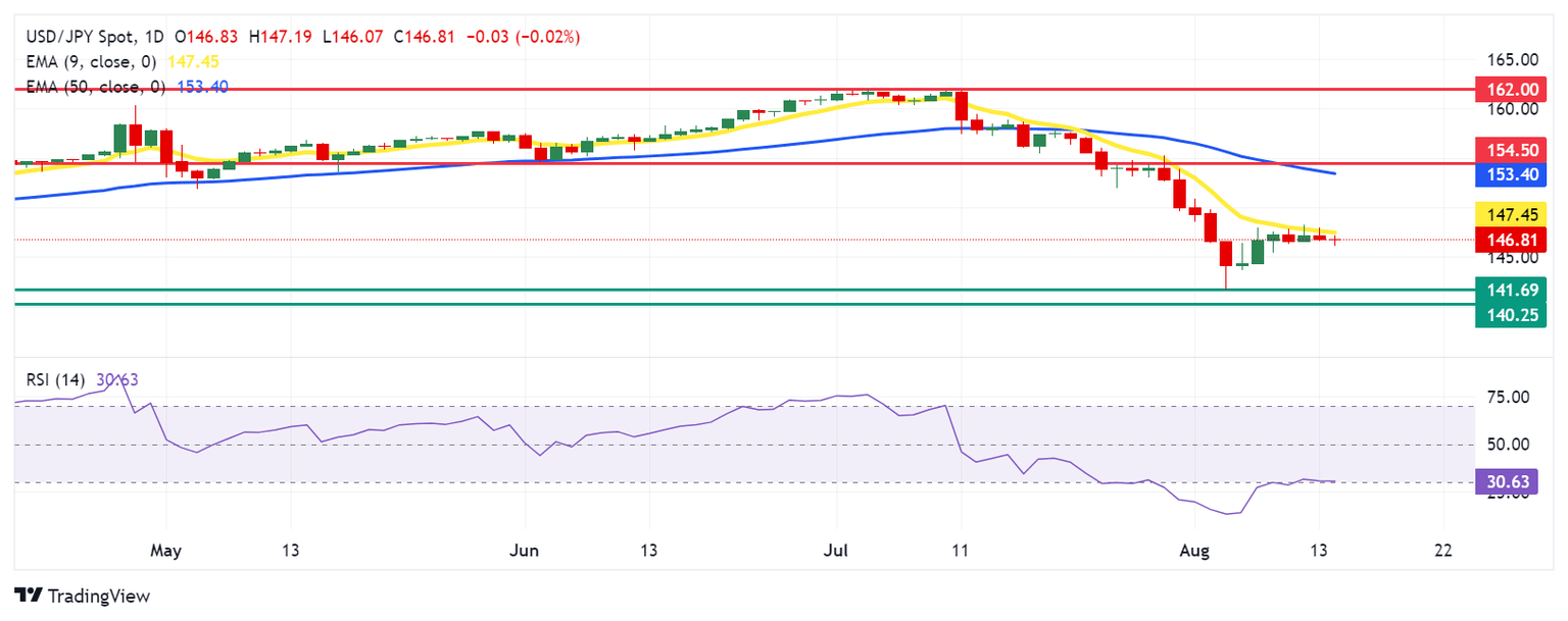 USD/JPY trades around 146.80 on Wednesday. The daily chart analysis shows that the pair remains below the nine-day Exponential Moving Average (EMA), suggesting a bearish trend in the short term. Moreover, the 14-day Relative Strength Index (RSI) is positioned at the 30 level, suggesting a potential for a correction.