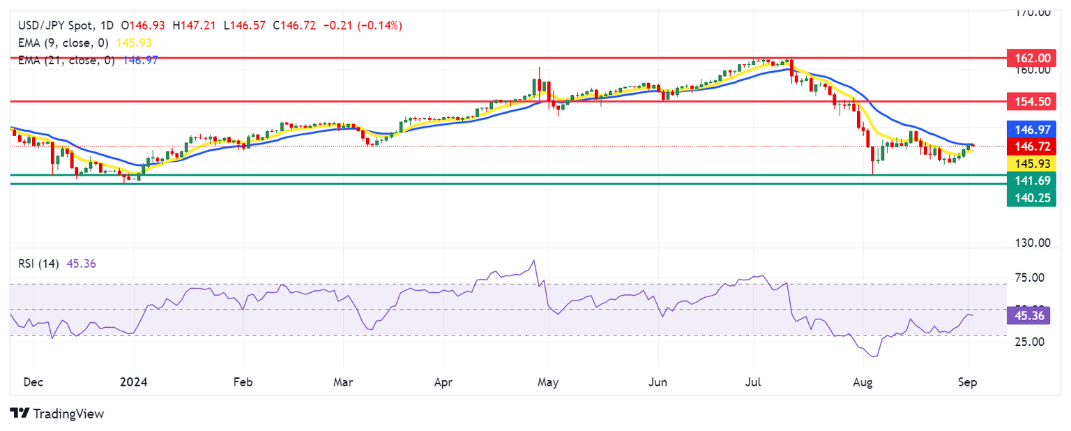 USD/JPY trades around 146.70 on Tuesday. Daily chart analysis shows the nine-day Exponential Moving Average (EMA) is lower than the 21-day EMA, indicating a bearish trend in the market. Additionally, the 14-day Relative Strength Index (RSI) remains below 50, indicating that the bearish trend is still in effect.