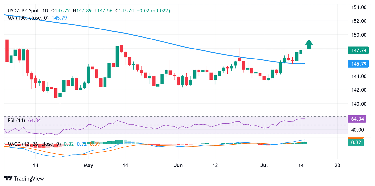The recent breakout through the 100-day Simple Moving Average (SMA) and a subsequent strength beyond the 147.00 mark was seen as a key trigger for the USD/JPY bulls. Moreover, oscillators on the daily chart have been gaining positive traction and are still away from being in the overbought territory. This, in turn, suggests that the path of least resistance for spot prices remains to the upside and backs the case for an extension of a two-week-old uptrend. From current levels, the June swing high, around the 148.00 mark, could act as an immediate hurdle, above which the currency pair could test the 148.65 region (May swing high) before aiming to reclaim the 149.00 round figure.