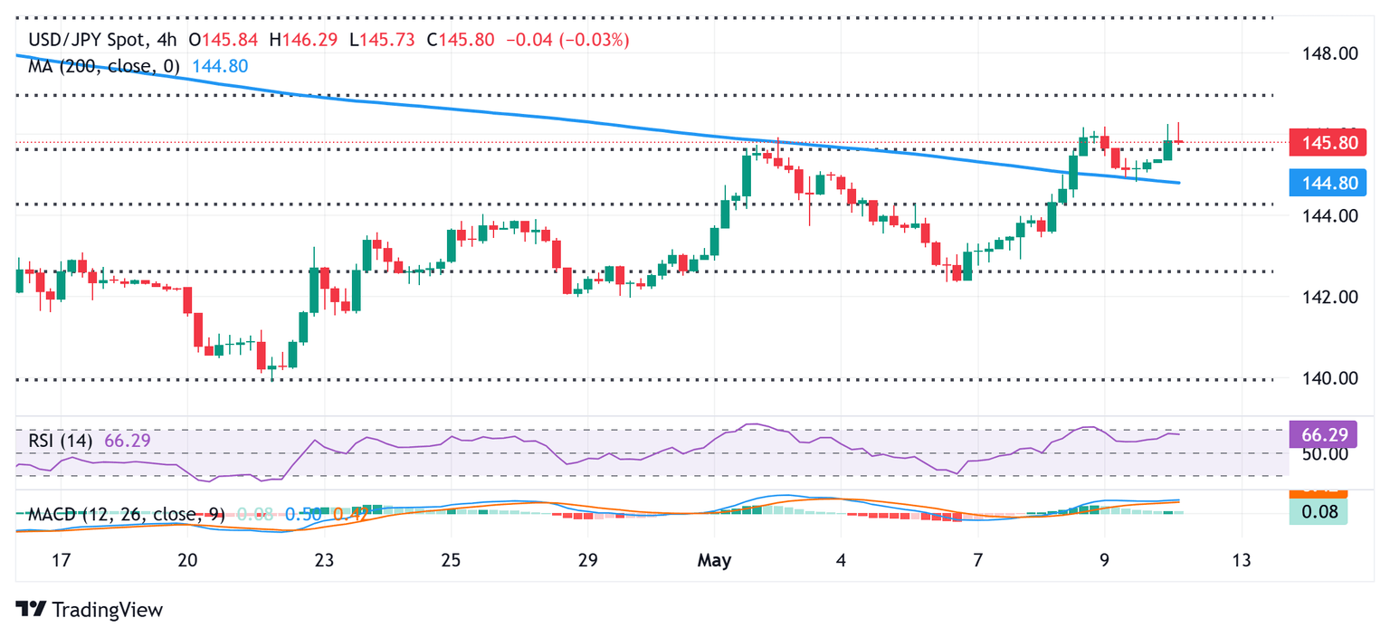 Meanwhile, the positive outcome from high-stakes US-China trade talks helps ease market concerns about the US recession. This, along with the Federal Reserve's (Fed) hawkish pause earlier this month, lifts the US Dollar (USD) to its highest level since April 10. The combination of supporting factors lifts the USD/JPY pair above mid-146.00s and supports prospects for additional gains.