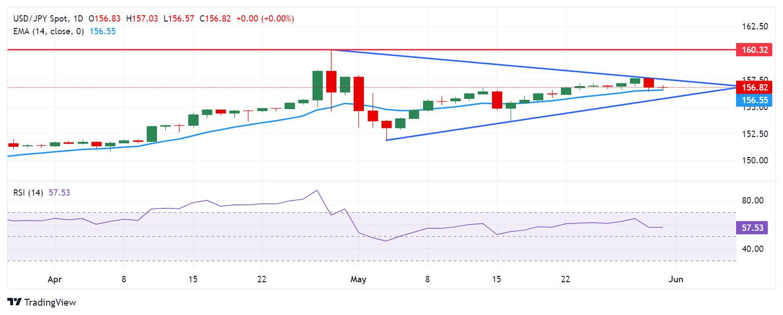 On the downside, immediate support appears at the psychological level of 157.00, followed by the 14-day Exponential Moving Average (EMA) at 156.55. A further decline could lead the USD/JPY pair to test the lower boundary of the symmetrical triangle.