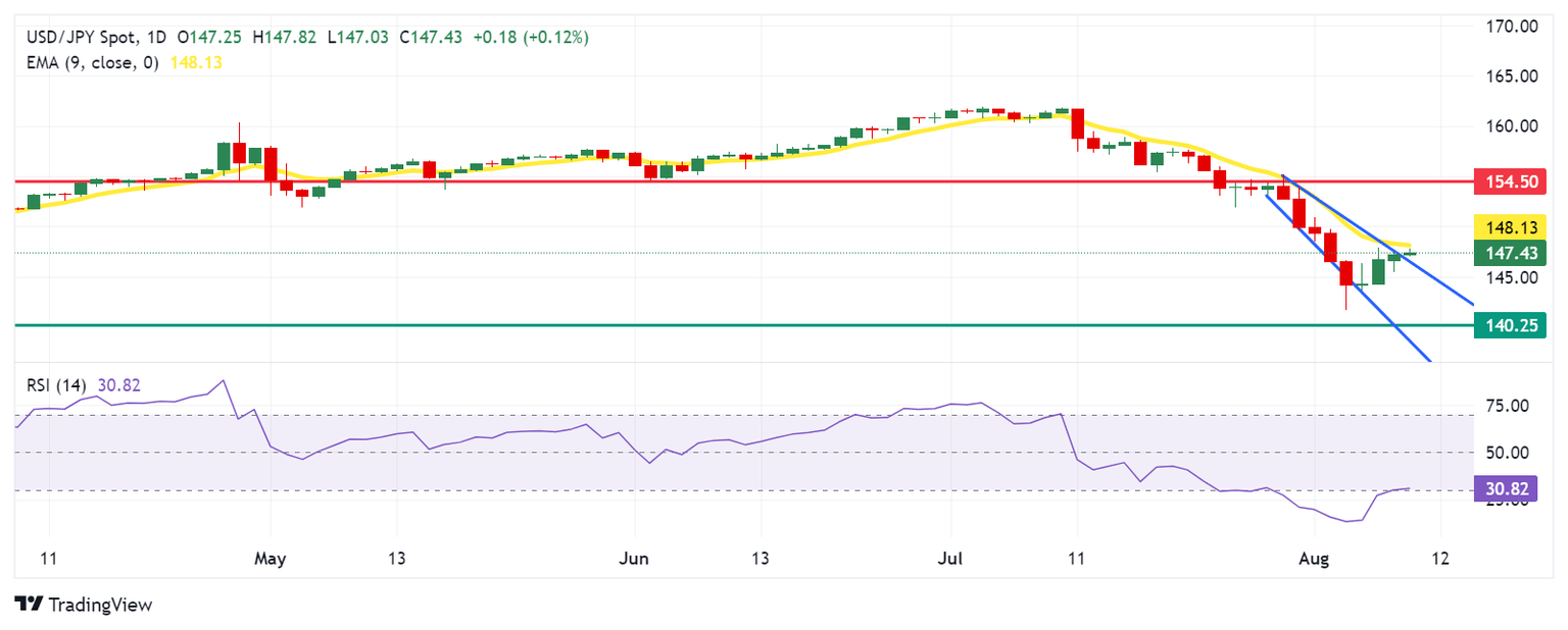 In terms of resistance, the USD/JPY pair could test the immediate barrier at the nine-day Exponential Moving Average (EMA) around the 148.13 level. A breakout above this level could diminish bearish momentum and allow the pair to approach the "throwback support turned resistance" at 154.50.