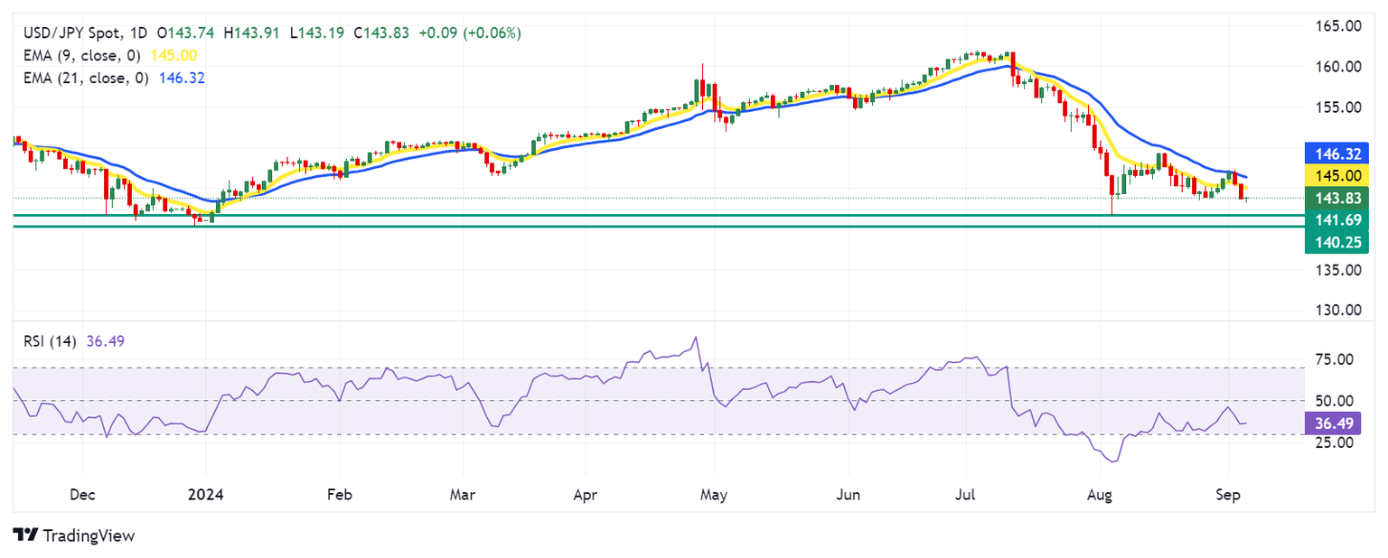 USD/JPY trades around 143.80 on Thursday. An analysis of the daily chart shows that the nine-day Exponential Moving Average (EMA) remains below the 21-day EMA, signaling a sustained bearish trend in the market. Furthermore, the 14-day Relative Strength Index (RSI) is hovering near the 30 level, confirming the ongoing bearish momentum but also suggesting a potential upward correction in the near term.