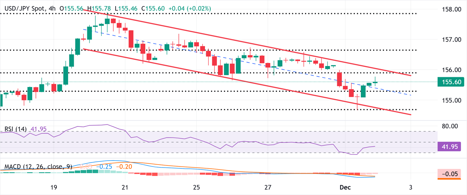 USD/JPY approaches descending channel resistance, around 156.00; not out of the woods yet