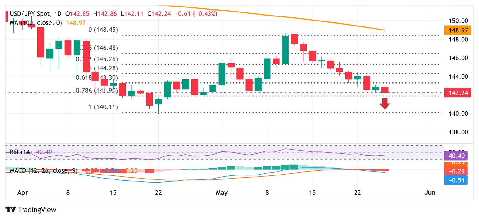 On the flip side, the 143.00 mark could protect the immediate downside ahead of the 142.50-142.45 region. Meanwhile, bearish traders might now wait for a sustained break and acceptance below the 142.00 mark before placing fresh bets. The USD/JPY pair might then slide below the 141.55 intermediate support, towards the 141.00 round figure. The downward trajectory could extend further towards the year-to-date low, or levels below the 140.00 psychological mark touched on April 22.