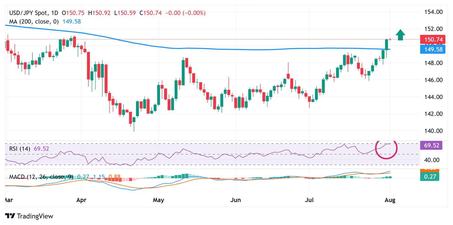 The overnight sustained breakout through the very important 200-day Simple Moving Average (SMA) and the subsequent strength beyond the 150.00 psychological mark was seen as a fresh trigger for the USD/JPY bulls. However, the daily Relative Strength Index (RSI) is on the verge of breaking into overbought territory, suggesting that spot price could pause the positive move at the March swing high, around the 151.20 region. Nevertheless, the broader setup backs the case for an extension of the recent well-established uptrend.