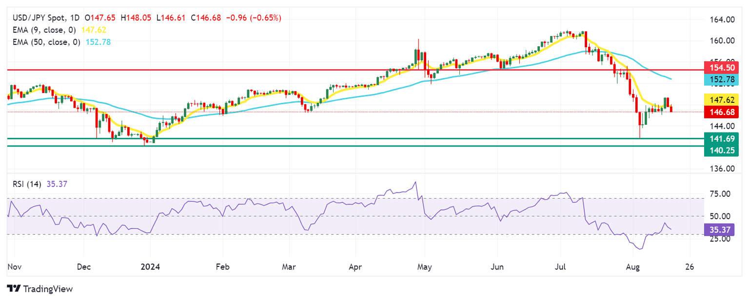 USD/JPY trades around 146.40 on Monday. Daily chart analysis indicates that the pair is slightly below the nine-day Exponential Moving Average (EMA), signaling a short-term bearish trend. Additionally, the 14-day Relative Strength Index (RSI) remains below 50, confirming the bearish momentum.
