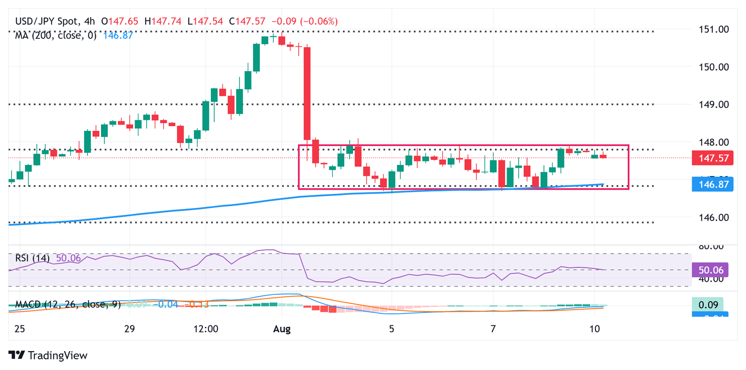 Investors seem convinced that the BoJ will raise interest rates by the end of this year. In contrast, the US central bank is expected to resume its rate-cutting cycle in September. This keeps the US Dollar (USD) depressed near a two-week low touched on Friday and acts as a tailwind for the lower-yielding JPY. Apart from this, nervousness ahead of the US-Russia bilateral talks on Ukraine offers some support to the JPY and contributes to keeping the USD/JPY pair below the 147.75-147.80 hurdle.