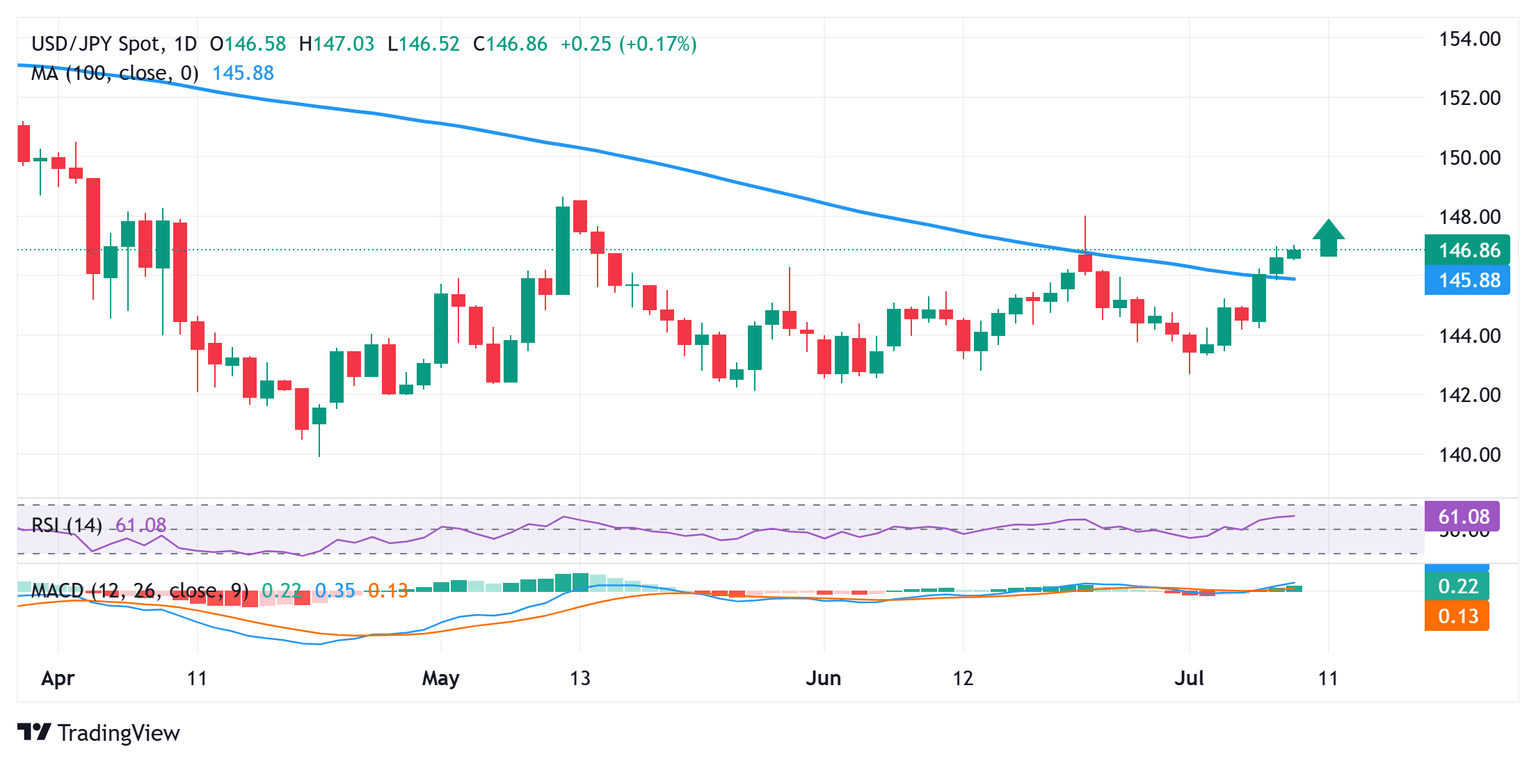 The USD/JPY pair's overnight close above the 100-day Simple Moving Average (SMA) for the first time since February could be seen as a fresh trigger for bullish traders. Moreover, oscillators on the daily chart have been gaining positive traction and are still far from being in the overbought zone. The technical setup backs the case for a further near-term appreciating move towards the 147.60-147.65 intermediate hurdle en route to the 148.00 round figure, or the June monthly swing high.