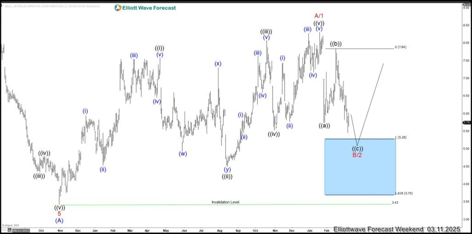 JetBlue Airways Corporation (JBLU), is a major U.S. airline headquartered in Long Island City, Queens, New York. Operating over 1,000 daily flights, it serves around 100 destinations across the Americas and Europe, with a focus on point-to-point travel and key hubs like New York’s JFK Airport. Known for its low-cost model paired with premium amenities—such as in-flight entertainment, free Wi-Fi via Fly-Fi, and the Mint premium cabin service—JetBlue has carved a niche by blending affordability with customer experience. Below we will take a look at the Elliott Wave technical outlook for the company.