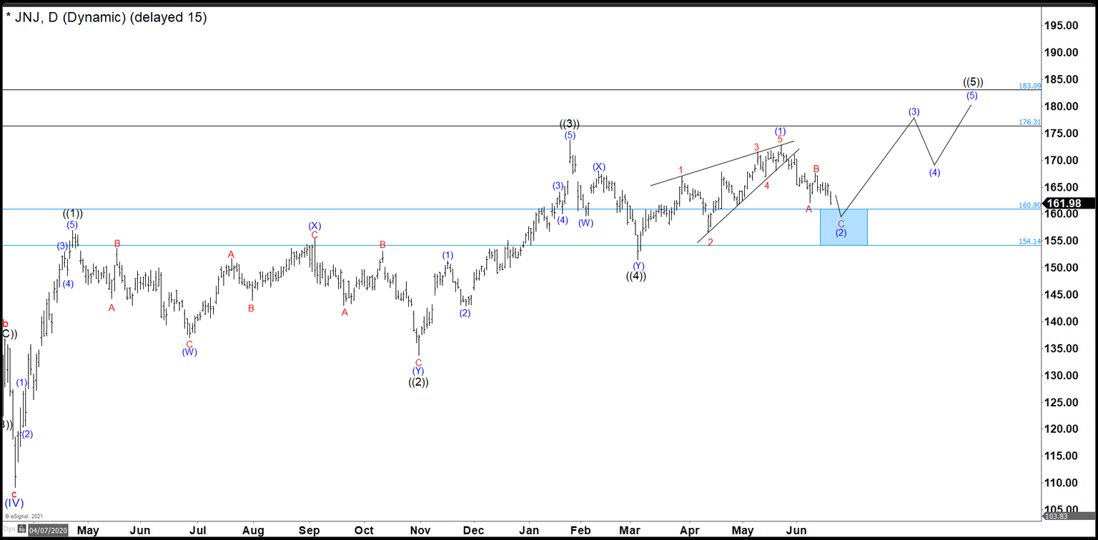 The share price continued to rise until reaching 172.79, which we call wave (1) and you can see the structure is a Leading Diagonal. From there, we have a clear correction in a zig zag as wave (2) missing our ideal entry for a few cents. Short term, we already have completed the wave 1 of (3) at 171.20 and wave 2 of (3) correction at 165.25. JNJ is moving forward with the rally and needs to break 171.20 to confirm the Elliott structure. We cannot rule out yet the possibility of a flat correction as wave 2. That means it could reach 164.94 before continue higher. That count is valid as we stay above 161.70 and the possible target to complete wave ((5)) comes in 178.97 – 187.48 area.