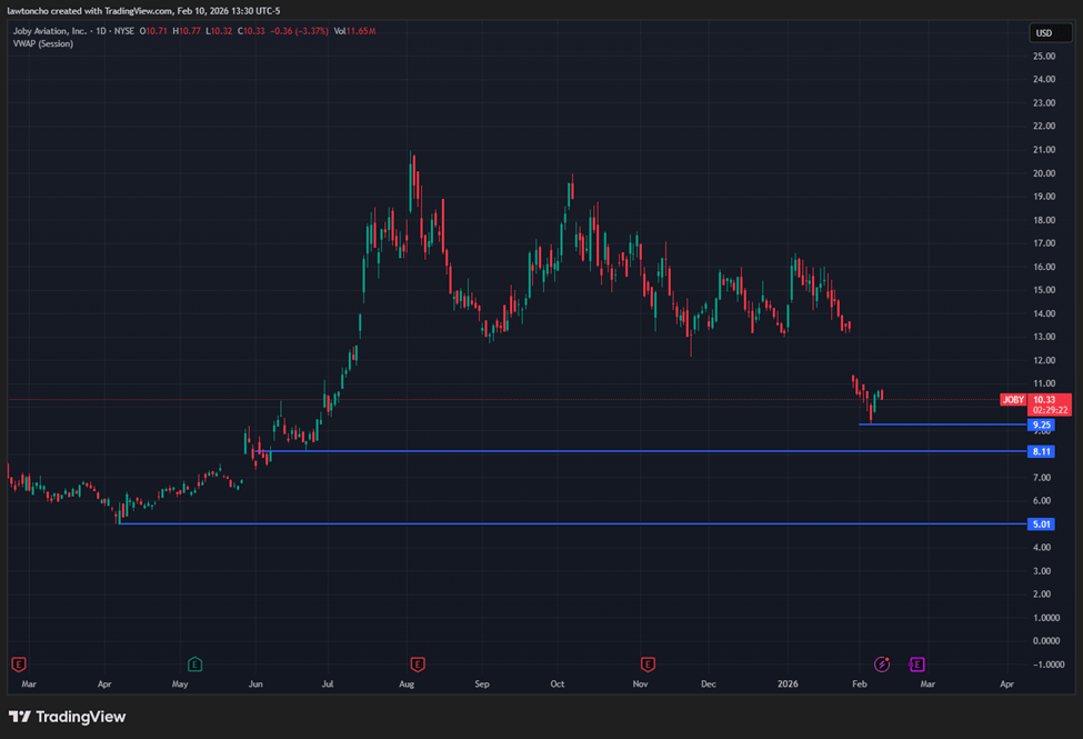 Last week, the stock experienced a notable breakdown, with price action pushing down toward $9.25 on Thursday before staging a sharp rebound of more than 12% on Friday. That bounce showed that buyers are still willing to step in at key inflection points, but the broader trend has not yet fully shifted. If JOBY begins to roll over again from current levels, I am watching several clear areas on the chart that could act as support.
