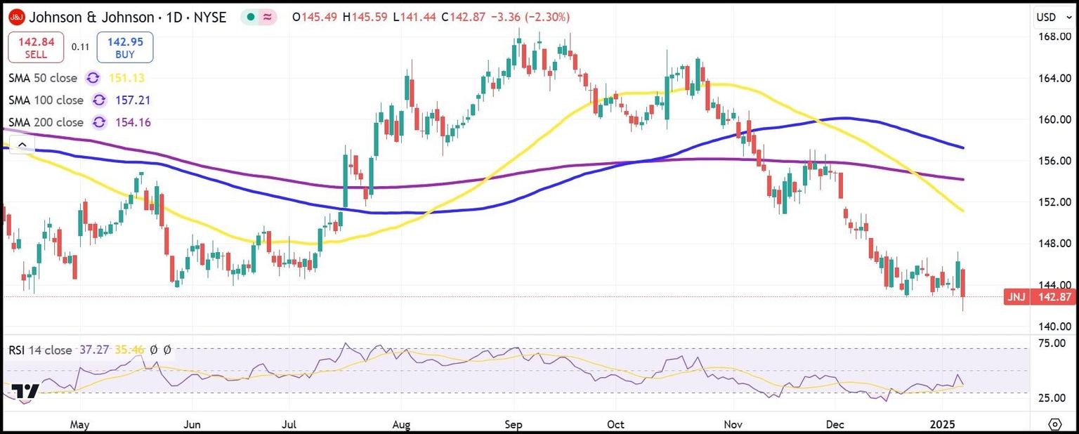 JNJ stock hit a 52-week low of $141.44 in the morning session before recouping some of that sell-off to trade 2.3% lower, while its primary index, the Dow Jones Industrial Average (DJI), sank 0.35% at the time of writing.