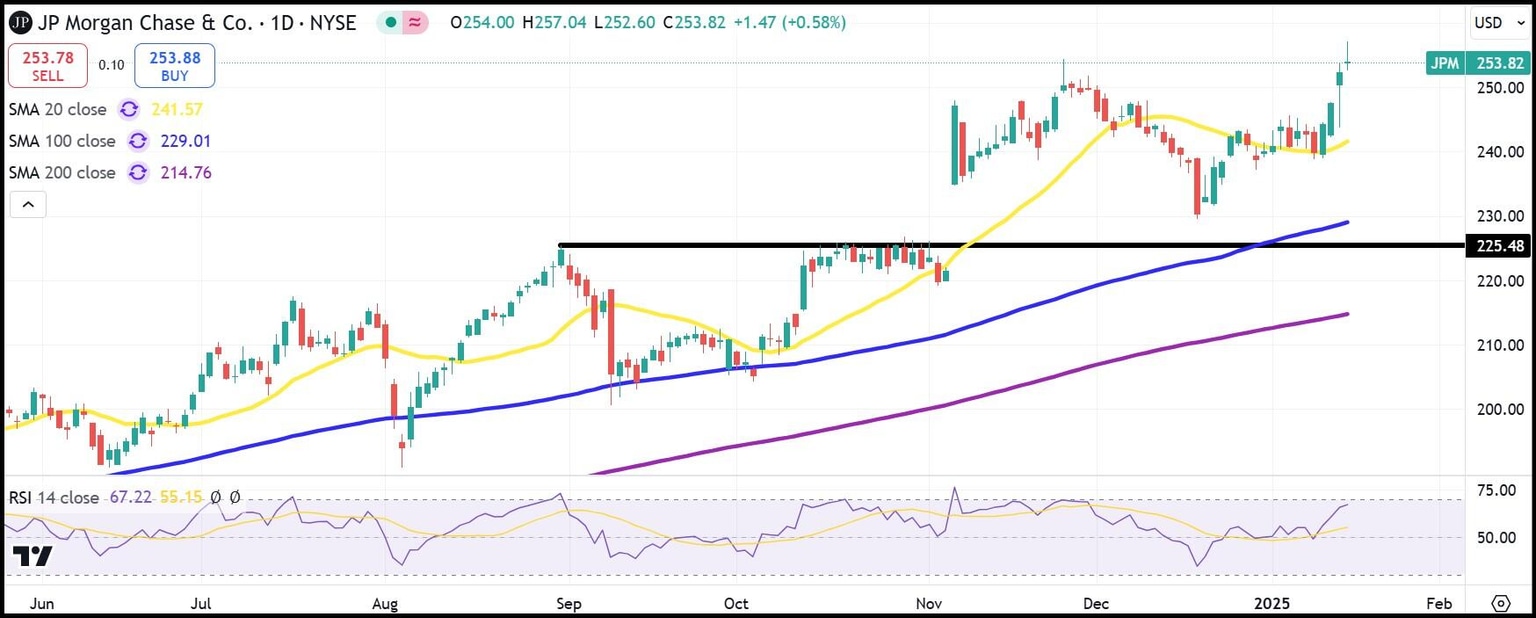 Now JPM stock is not overpriced to be sure. But with the Relative Strength Index (RSI) reading 66, there is more room for downside than upside. A better entry for buyers would be to wait until JPM drops back to $230. That's where shares found a landing on December 18 and also where the 100-day SMA is trending toward.